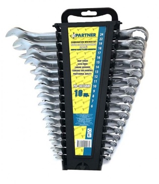 Ключи комбинированные - рожково-накидные. Размеры: 6, 7, 8, 9, 10, 11, 12, 13, 14, 15, 16, 17, 19, 22, 24 мм. На пластиковом держателе.
