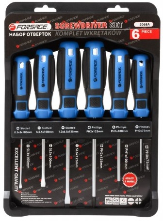 ОписаниеНабор отверток 6 предметов (SL: 5, 5.6, 5.8мм, PH: 1, 2, 3) в лотке