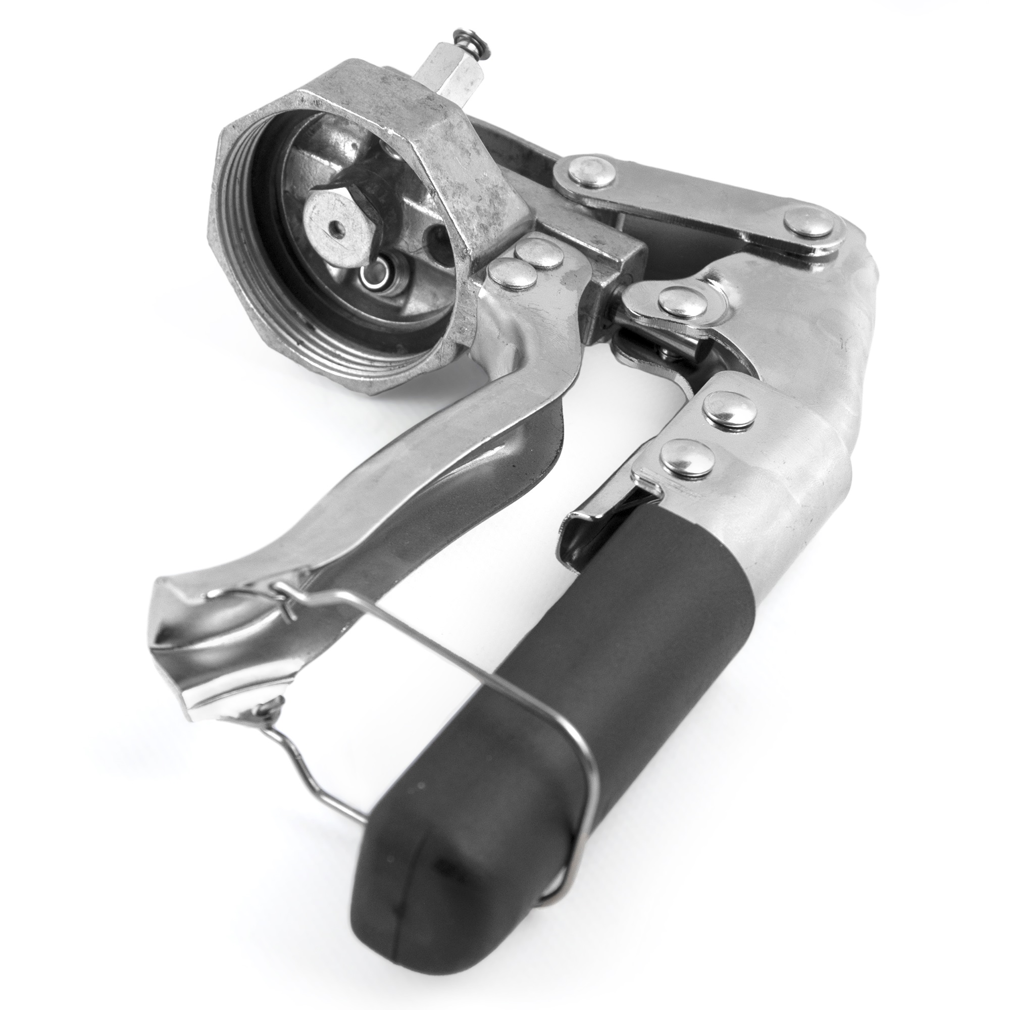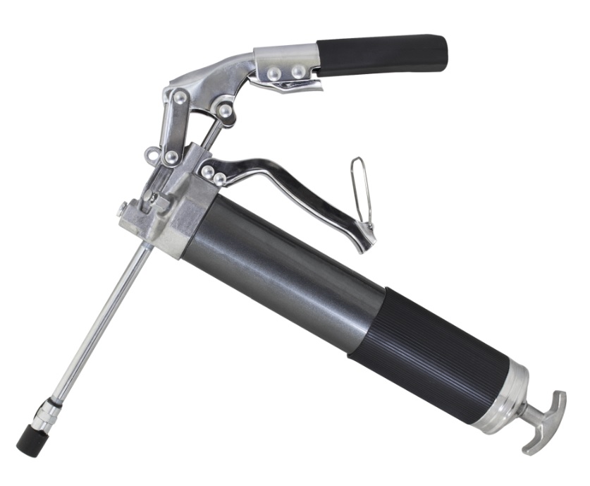 Модель удобна тем, что представляет собой «трансформер» – ручку для рычажно-плунжерной конструкции не нужно присоединять, достаточно просто выдвинуть. Резиновое покрытие у основания предотвращает скольжение рук, что делает работу более безопасной и удобной. На литой головке из алюминия – клапан для стравливания воздуха, чтобы смазка подавалась сразу при первом нажатии на рычаг. Это обеспечивает качество работ, так как избавляет от «ложного смазывания». Оснащен прокладкой для того, чтобы в местах с повышенным давлением не возвращалась смазка. Эта модель обладает очень высокой производительностью.